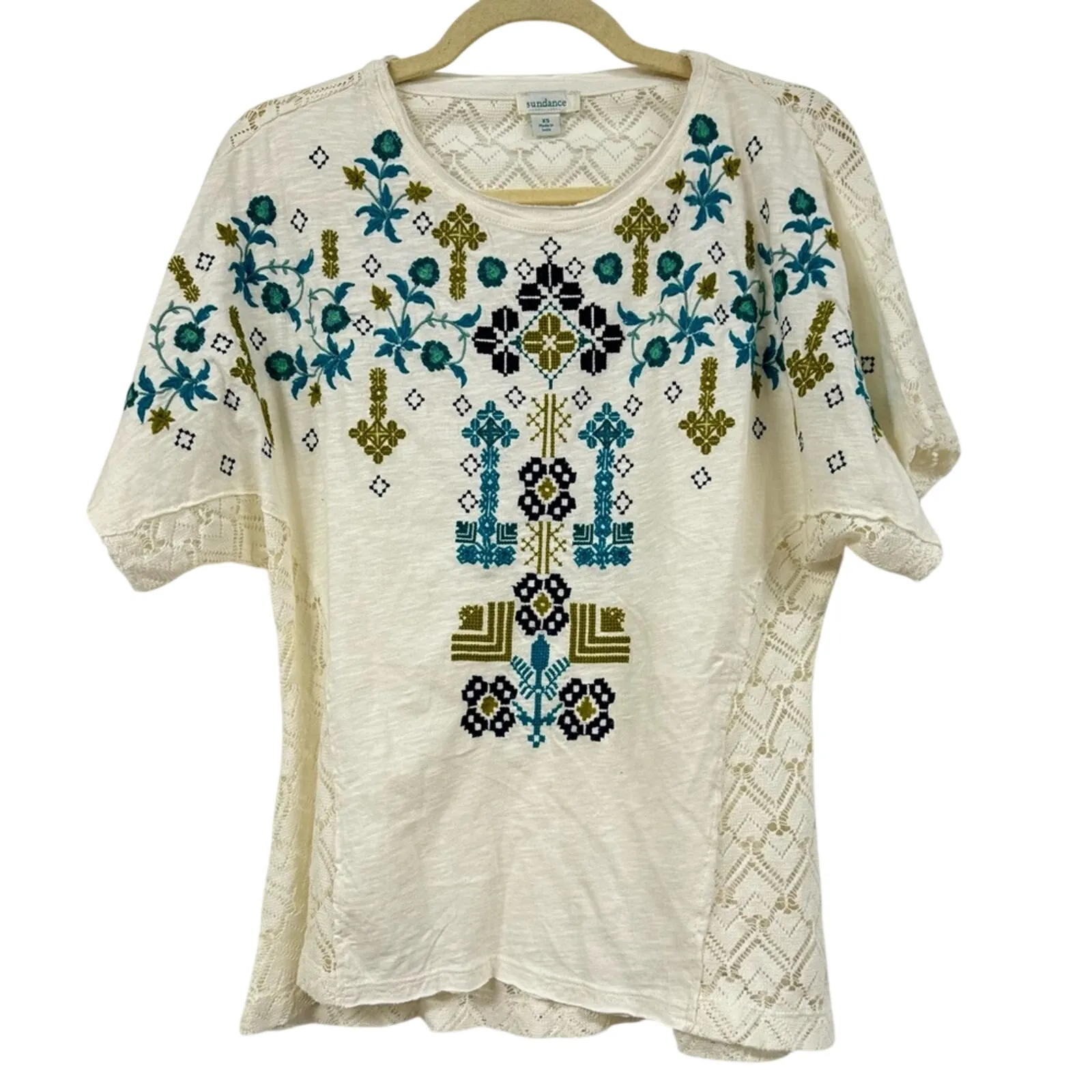 Sundance Boho Cream Floral Embroidered Crochet Short Sleeve Blouse Womens XS Green - $40 - From Lisa