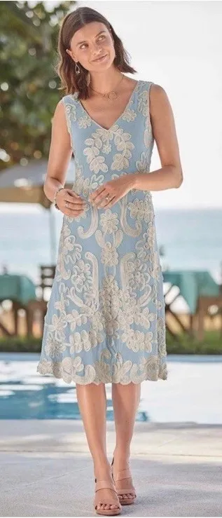 Sundance Cameo Midi Dress Women's Size Large Floral Appliqué Embroidered Embroidery Mesh Lace Overlay Winter Sky Blue Feminine Modest Midi Length Sleeveless Stretch Excellent used condition, no flaws Approx measurements laid flat Pit to pit: 19 inches Full length: 41 inches