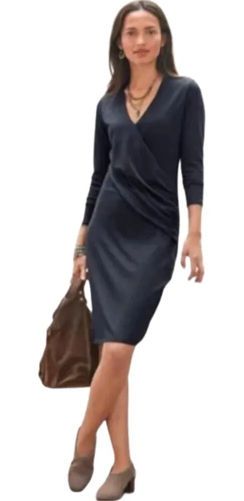 The Sundance Criss Cross Draping V-Neck Knee Length Wrap Dress in black is a stylish and versatile piece for women in size Large. Made from a blend of cotton and modal, this dress features a flattering V-neckline, 3/4 sleeves, and a pullover closure for easy wear. With a knee-length hem and slimming features, this dress is suitable for various occasions including travel, weddings, parties, and casual outings. The minimalist yet elegant design makes it a perfect choice for year-round wear, whether for a beach day or a night on the town. Condition: Excellent Used Condition (no stains/holes/flaws)! Size: Large, L Material: 52% Modal, 48% Cotton Measurements (taken while garment is laying flat): Underarm to Underarm: 20" Waistline: 17" Top of Shoulder to Bottom Hem: 38" Ships FAST, within 24 hours of order placement! Career Professional Interview Business Casual Party Event Wedding Guest Modest Church Travel Vacation Trip Cruise Night Going Out Date Classic LBD Slimming Stretch Flattering Versatile Capsule Wardrobe Minimalist Neutral Preppy