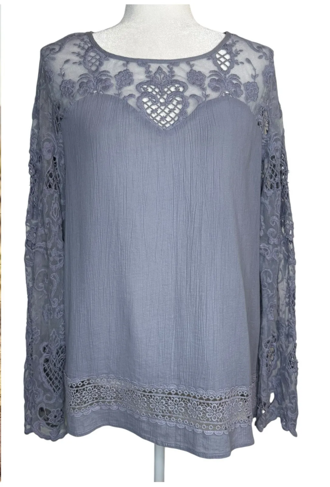 Beautiful Sundance long sleeve blouse featuring a romantic floral crochet lace overlay and soft cotton gauze body in a dusty periwinkle blue. The intricate lace detailing along the neckline, sleeves, and hem adds a timeless vintage-inspired charm. Made from breathable natural fibers for a comfortable, flowy fit — perfect for everyday wear or dressed up for special occasions. Details: Brand: Sundance Size: Medium Color: Dusty blue / periwinkle Material: 100% Cotton body, 80% Cotton / 20% Nylon contrast, 100% Cotton trim Features: Sheer lace yoke & sleeves, scalloped trim, keyhole back detail, lined body Style: Boho, romantic, feminine, cottagecore Condition: Excellent pre-owned condition, no flaws noted Measurements shown in photos This ethereal top pairs beautifully with jeans, linen trousers, or a flowy skirt — ideal for a soft, feminine boho look. Ships within 24 hours Keywords / Tags Sundance • Boho Chic • Romantic Lace Top • Cottagecore • Prairie Blouse • Feminine Style • Festival Fashion • Western Boho • Victorian Inspired • Shabby Chic • Gauze Cotton • Long Sleeve Blouse • Floral Lace • Soft Blue Top • Coastal Cowgirl • Whimsigoth • Country Romance • Effortless Elegance • Artsy Layering • Peasant Top • Modern Vintage