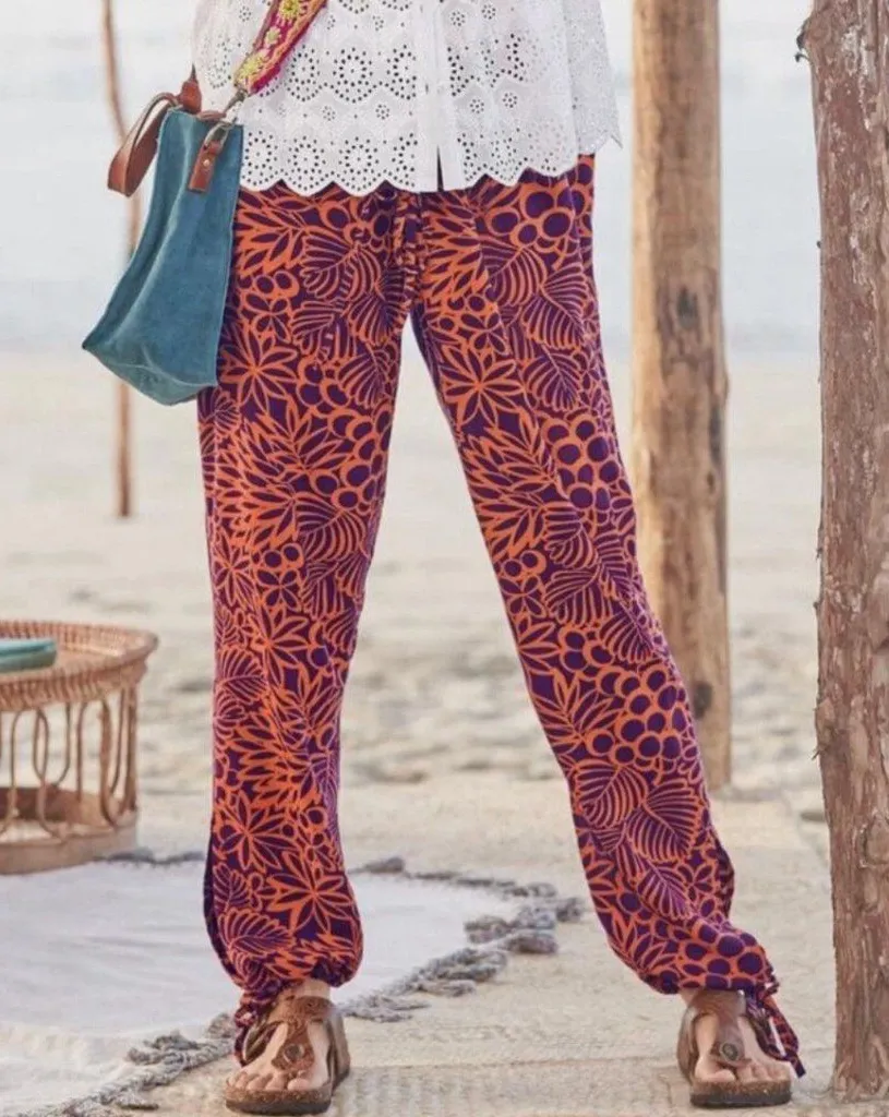 Sundance Floral Paradise Hippie Pants in the color orange and purple. Size medium, petite womens. In great pre-worn condition, no major issues. 100% viscose. Super cute bohemian, boho chic, vacation, hippie, colorful, travel, beach, spring summer style. Sundance lightweight reversible tie waist pants in a beautiful orange and merlot floral color scheme. Adjustable tie waistband. Great beach pants, boho loungewear look with a pop of color. //D383, 7.4