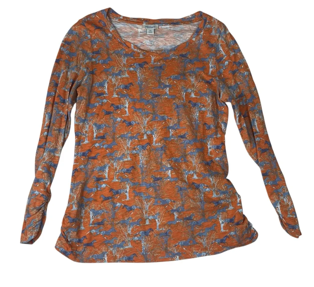 Sundance long sleeve shirt in women's medium petite. Good used condition. Stylish women's top featuring a vibrant orange and blue horse pattern. Perfect for adding a pop of color to your wardrobe.
