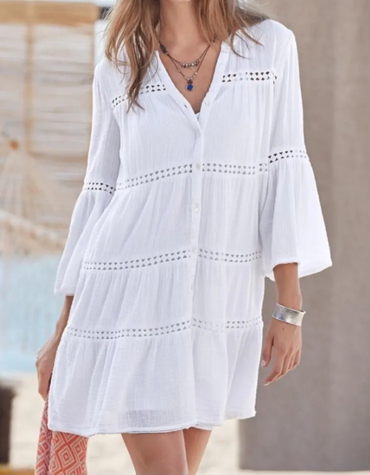 Very good used condition. Has been worn and washed. No flaws. Measurements when laying flat Pit to pit 21” Top hem to bottom (measured from center back neck to bottom) 35” From the resort collection, the Sundance Midori Day Dress is made from 100% breathable cotton. Features textured corded cotton, a tiered silhouette, decorative embroidered trim, 3/4 bell sleeves and a button-front design that’s flattering and easy to wear. Lightweight and airy—perfect for warm weather, travel, or casual everyday wear. Please note that this dress was originally sold with a slip that is not included. Sundance cotton day dress, boho white dress, tiered cotton dress, button front dress, lace trim dress, cottagecore, coastal, casual summer dress, breathable cotton dress, relaxed fit dress, vacation resort wear dress, beach pool swim bathing suit coverup cover up