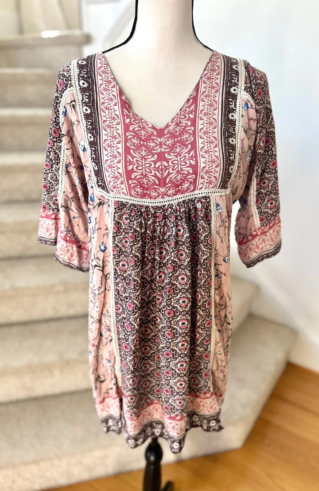 Excellent condition. Pink mosaic and floral patchwork print with crochet lace trim. Short sleeve, key hole back. Petite Medium pit to pit 18.5 inches shoulder to hem 31 inches Rayon