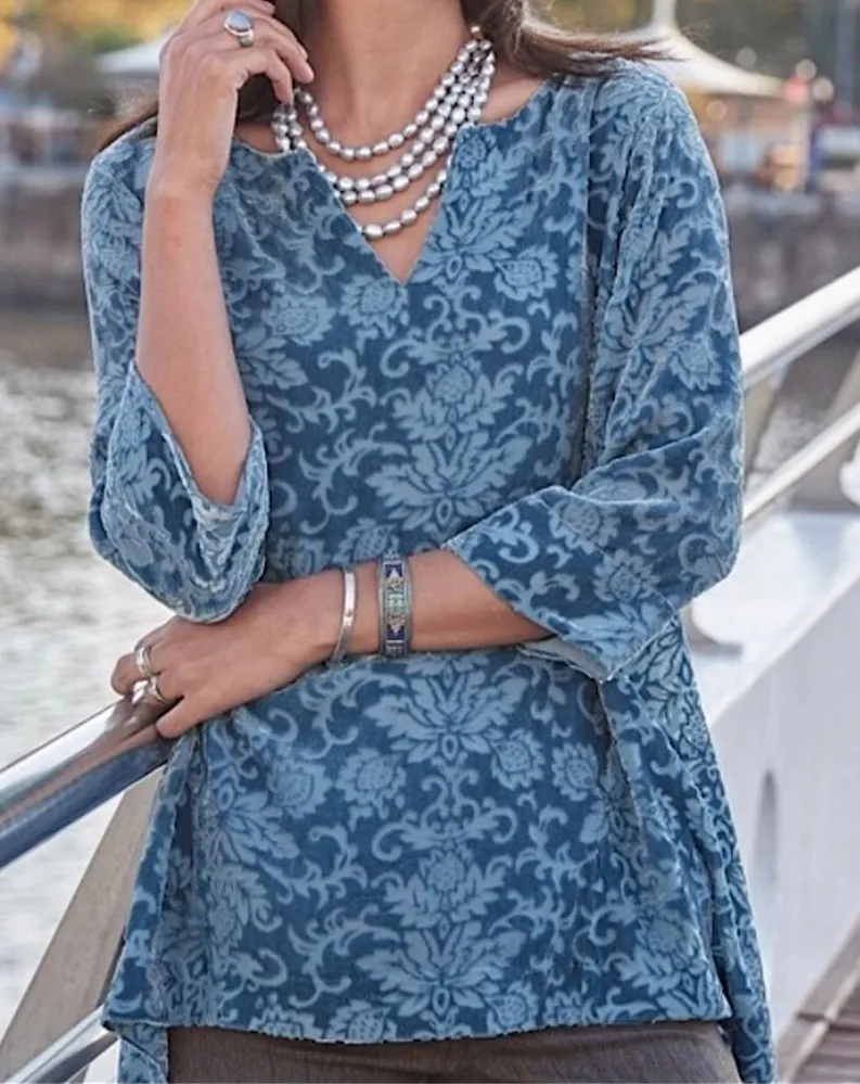 Sundance Regal Velvet Burnout Silk Tunic Blouse Floral Blue Fog Medium. Three-quarter sleeves. Front... Show more