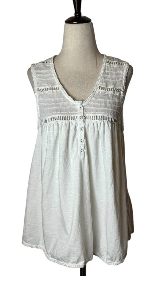 A white sleeveless v-neck tank top with delicate lace trim. This top features a flattering V-neckline with a three-button placket and intricate smocked detailing across the yoke and shoulders, offering a bohemian-inspired aesthetic. The relaxed fit and airy design make it perfect for warm weather. 100% Cotton Great Pre-Owned Condition (see pics for details) Measurements: armpit to armpit 18.5 in, length 24.5 in, All offers welcomed! ❤️ Professional seller, smoke free home and same or next day shipping. Like items for price drops. Receive the 30% off bundle discount when you purchase two or more items.
