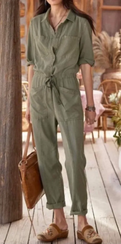 Sundance Wayside Jumpsuit Vintage Wash Roll-Tab Straight Leg Tencel Olive Green Petite Small PS. Vintage-wash jumpsuit featuring roll-tab sleeves, six pockets, seaming detail and functional tie. This garment has been dyed and washed to achieve vintage look and softness. Subtle differences in shades are typical of this dye process. 100% Tencel. Approx measurements: 19“ pit to pit, 52.5“ length, 12“ rise, 25.5“ inseam, & 17“ waist. Great pre-owned condition. No stains/flaws. Smoke/pet free home. Offers welcome. Bundle & save. Ship same/next day. Packaged w/ care.