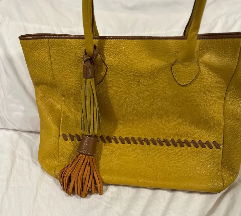 Sundance yellow pebbled vegan leather tote Bag with brown stitching and tassels. - $20 - From Melanie