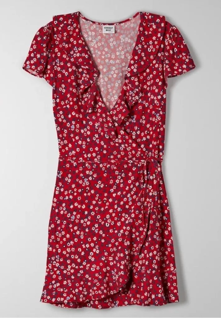 Sunday Best floral mini dress Red, white, and dark navy blue V-neckline Ruffle detail Short Sleeve Wrap/tie waist 100% viscose Size 2XS Measurement's lying flat: 18 inches underarm to underarm (taken across the back 30.5 inches top to bottom Gently worn, no flaws Reach out with any questions!