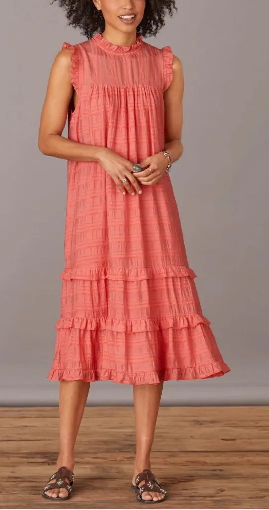 In excellent condition, no flaws. Ruffled sleeves. Contrasting textures of same color material stripes. Double lined. Beautiful button down back of neck. High neckline. Size: Large Color: Coral Chest: 23” Length: 46” SKU: 128/10
