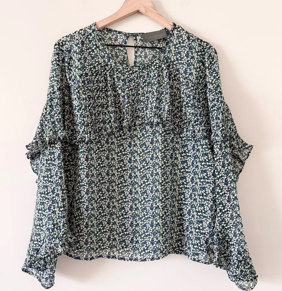 Excellent condition Size L Sheer Ruffle details Flare sleeve Chic floral print top for women. Features a stylish design perfect for any occasion. Measurements PTP 20” Length 24” Smoke free home