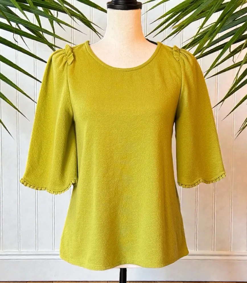 Bright, cheerful, and effortlessly wearable, this Sunday in Brooklyn Astley top features a beautiful chartreuse green textured fabric with flutter sleeves and subtle pom-pom trim along the sleeve hems. A relaxed silhouette that’s easy to dress up or down—perfect with denim, trousers, or skirts. Details: • Brand: Sunday in Brooklyn • Style name: Astley • Color: Chartreuse green • Sold at Anthropologie • Textured fabric • Flutter sleeves with pom-pom trim • Pullover style Condition: • Gently used, very good condition • No holes, stains, or major flaws noted Measurements: • Please see photos for measurements (taken flat) A great everyday top with a fun pop of color—ideal for spring and summer wardrobes.
