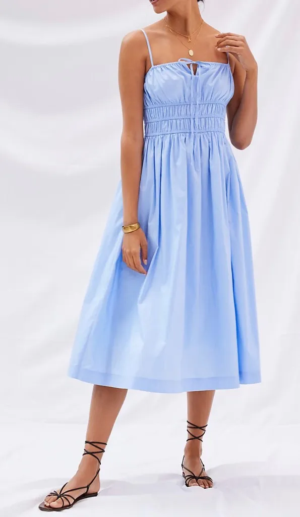 Anthropologie Sunday in Brooklyn Sleeveless Smocked Midi Dress Size M Color Blue Condition New With Tags Sleeveless Square neckline Adjustable spaghetti straps Split neckline with adjustable tie detail Smocked waist Voluminous skirt Lined Measurements laying flat: Pit to pit 19“, Length 44“