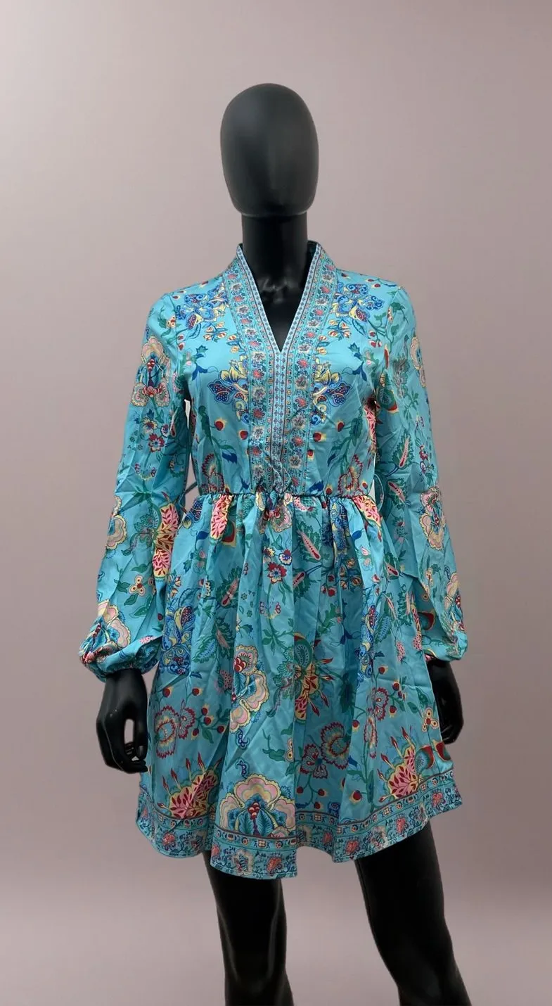 🌿 Boho Chic Vibes with a Free Belt! 🌿 Turn heads in this vibrant blue floral mini dress by Sunday Up, perfect for festivals, beach days, or brunch dates! Features a flattering v-neckline, smocked waist, and flowy silhouette with long puff sleeves and gorgeous multicolor embroidery-inspired print. ✨ Comes with a FREE woven brown leather belt to complete the look! 💙 Lightweight 100% polyester — soft, breathable, and ideal for warm weather. 💕 Style it with boots, sandals, or sneakers for a carefree, Insta-worthy outfit. C/7