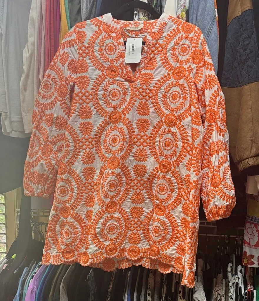 Stylish tunic shift Dress with vibrant orange floral patterns. Lightweight and comfortable. Ideal for casual outings. Unlined. Could be a beach coverup, preppy, church, picnic, vacation