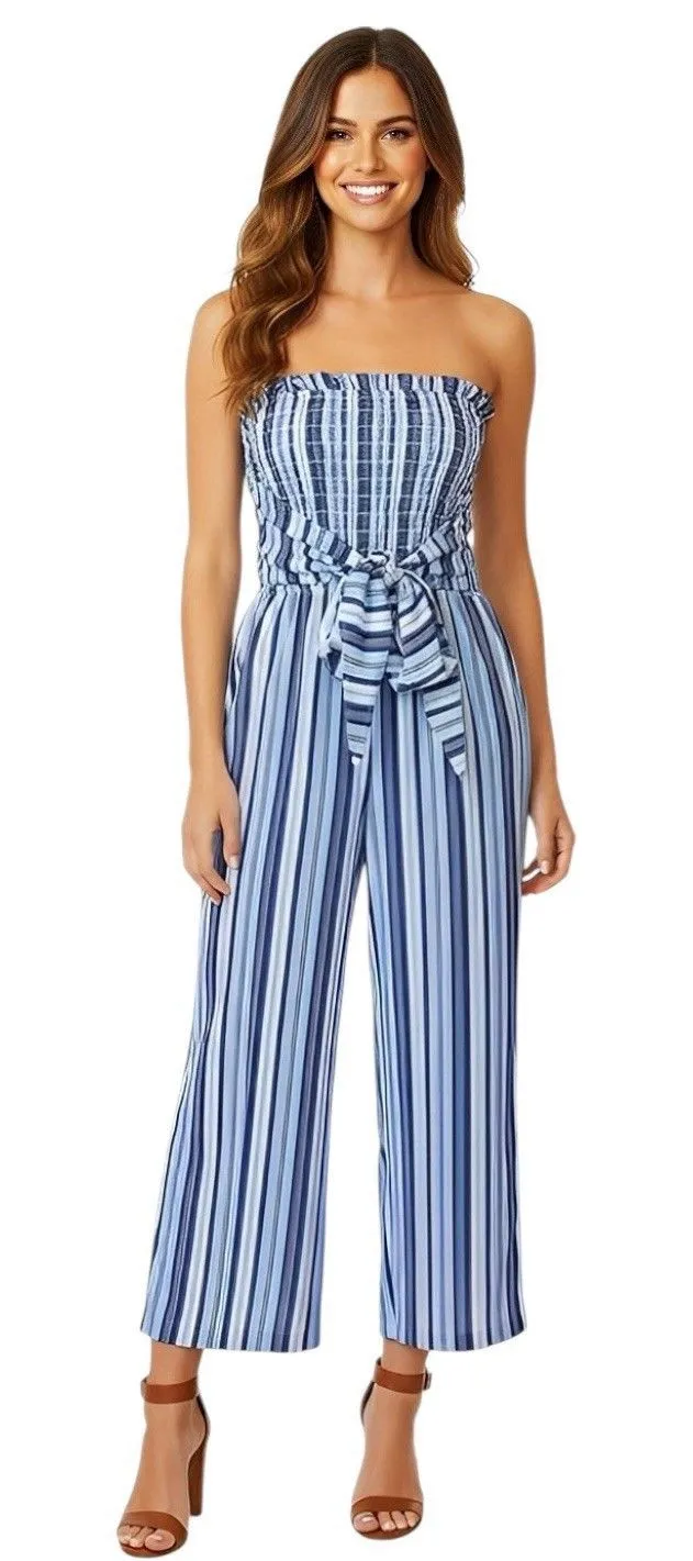 Sunday Up Womens Jumpsuit Sz Medium Blue White Strapless Striped Front Tied Bohemian Beach Coastal C... Show more