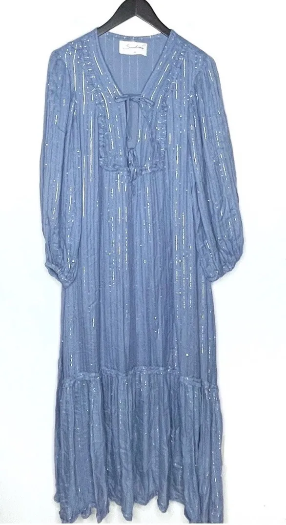 Sundress Maria Dress in Roma Powder Blue XS/S 100% viscose. Fully lined Absolutely gorgeous with tie accents at the neck, silver metallic thread and tiny sequins that catch the light as you move! Revolve Style No. SDRE-WD32 Manufacturer Style No. S19051