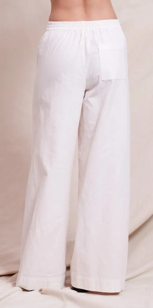 Lace up wide leg pant with shoestring ties that are perfect to pair with a cropped top or tucked in sweater. 100% Cotton Made in USA Machine wash cold- Do not bleach Tumble dry at low heat - cool iron if needed Size XS Brand new with tags! spring, summer, beachy, resortwear, breathable, thick, stretch, elastic waist, stretchy, pull on, drawstring, minimalist, coastal grandma, casual, wide-leg, relaxed fit, loose, preppy