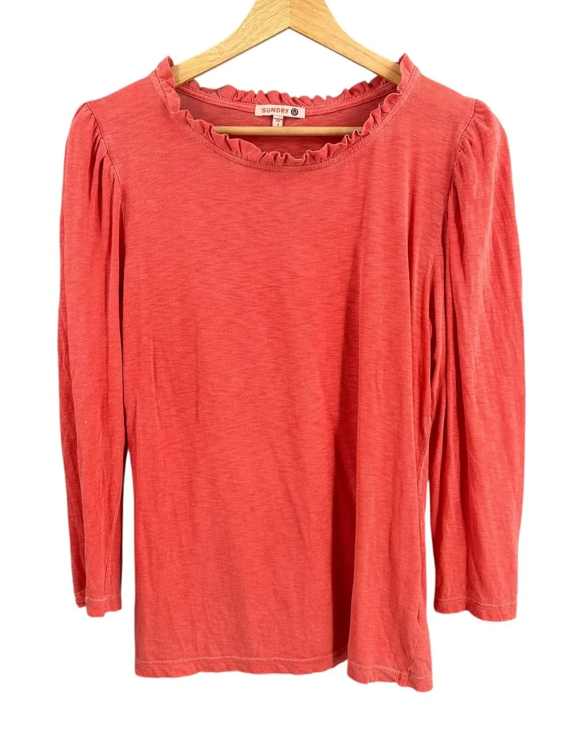Sundry Women's Ruffle Neck Long Sleeve Tee Size: 1 (Small) Color: Orangish-Red / Coral Material: 100% Pima Cotton Made in USA Measurements: - Armpit to Armpit: 19" - Length: 25" - Sleeve Length: 20" Features: - Ruffled neckline - Lightweight soft fabric - Relaxed fit - Long sleeve with slight puff shoulder Condition: Excellent pre-owned. Keywords: Sundry, coral top, ruffle neck, pima cotton, long sleeve, casual, basic, minimalist, everyday, soft, comfortable, lightweight, crew neck