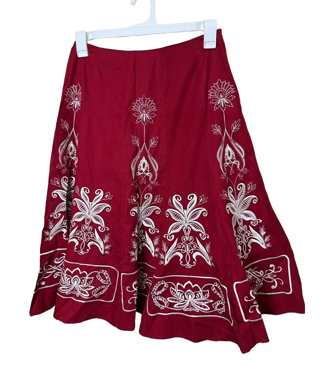 Sunny Leigh Skirt Womens Size 8 Red Flare Embroidered Floral Cotton Boho Condition: Good condition. No flaws Size: 8 Material: 100% Cotton Features: White embroidered floral patterns, Abstract embroidery, Flowing flare silhouette, 100% Cotton fabric Measurements: Length: 28 inches Waist: 15 inches Tags: floral embroidery, cotton, bohemian style, spring fashion, summer outfit, folk inspired, ethnic print, casual wear, vibrant, natural fabric, garden party, indie aesthetic WN AD