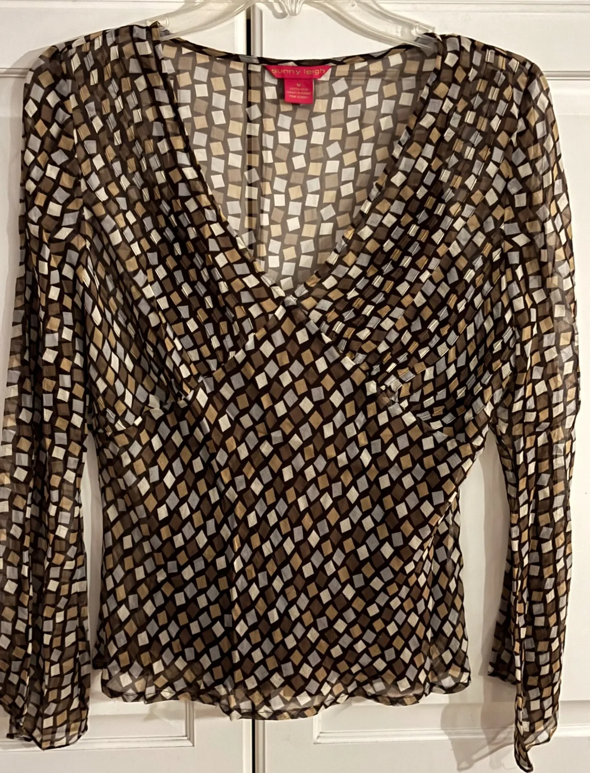Elevate your style with this stunning Sunny Leigh sheer blouse, a captivating piece that whispers sophistication and charm. Its intricate diamond pattern, a mosaic of rich browns, earthy tans, and subtle creams, creates a mesmerizing visual effect that draws the eye. The flattering V-neckline and billowy long sleeves add a touch of graceful femininity, perfect for transitioning from day to evening. Imagine yourself dazzling at a chic brunch, making a memorable impression at an evening cocktail party, or adding a touch of refined elegance to your vacation wardrobe. Has silk cami underneath that is fully detachable. Measurements: • Bust: 19 in • Length: 24 in • Waist: 17 in • Sleeve Length: 24 in Type: Blouse Department: Women Style: Tunic Material: Silk Neckline: V-Neck Sleeve Length: Long Sleeve Sleeve Type: Bell Sleeve Pattern: Geometric Features: Lightweight Fit: Regular Fabric Type: Chiffon Occasion: Casual, Party/Cocktail Closure: Pullover Season: Spring, Summer, Fall Unit Type: Unit Keywords: Sunny Leigh, sheer blouse, diamond print, v neck, long sleeve, silk blend, elegant, sophisticated, womens fashion, day to night, dressy casual, statement piece, fall fashion, spring fashion, career wear