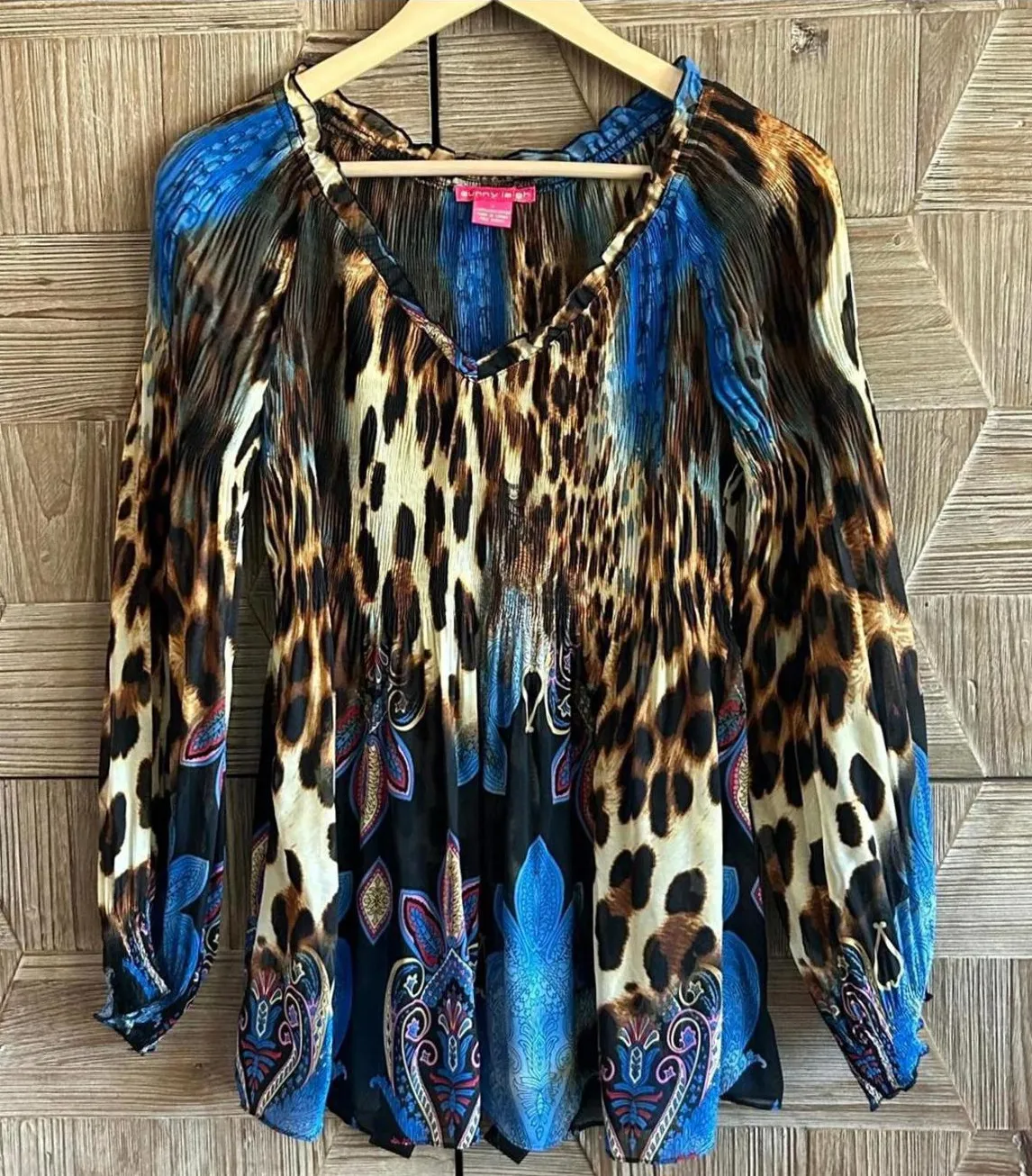 EUC Sunny Leigh Animal Print Tunic Stretchy Top Size Small, Long Sleeve, Ruffle V Neck Measurements... Show more