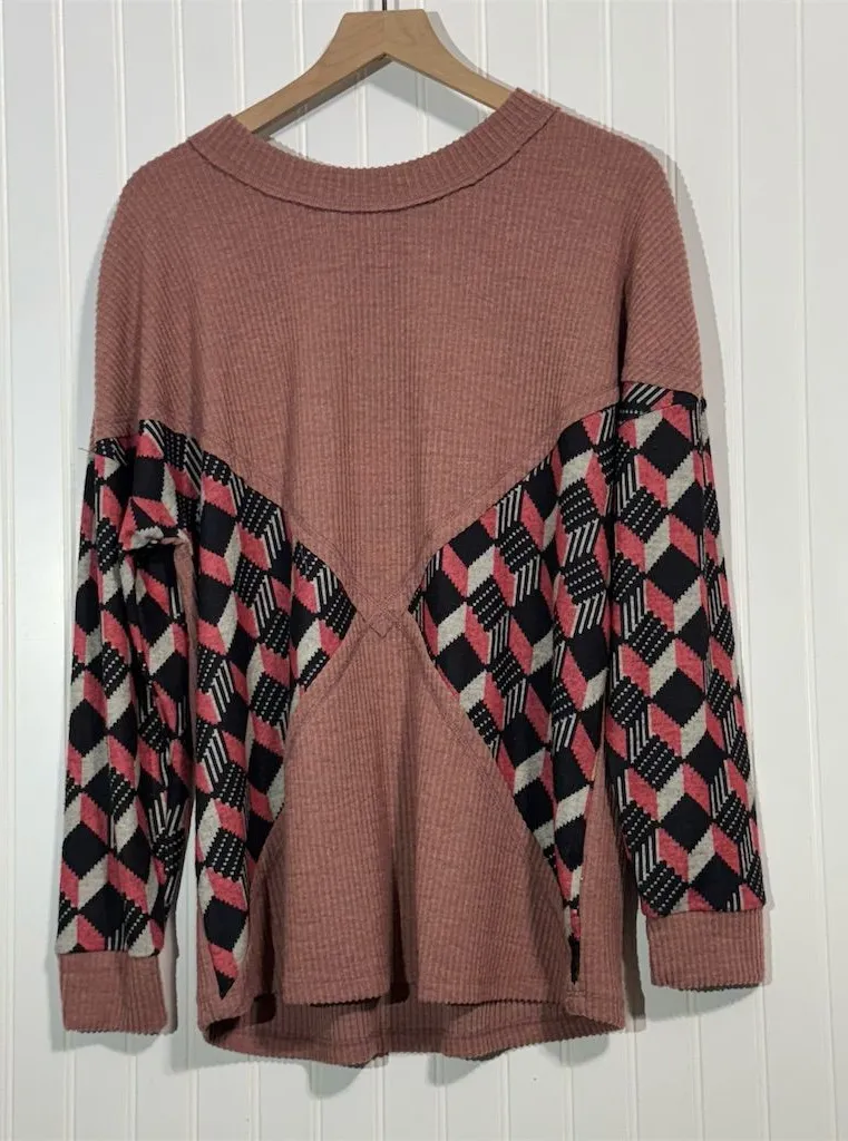 Unique and trendy Sunshine & Rodeos sweater in women’s size M. Features a muted rose ribbed knit base with bold black, pink, and cream geometric patterned sleeves and panels. Perfect mix of cozy + statement, easy to style with denim, cargos, or skirts. ✨ Style aesthetics: Indie Sleaze Revival, Soft Grunge, Retro Boho, Fall Cottagecore, Y2K Streetwear. Ideal for layering this fall + winter and pairs perfectly with trending wide-leg denim or mini skirts. • Brand: Sunshine & Rodeos • Size: M (see measurements) • Color: Rose with geometric multicolor accents • Material: 65% Polyester, 30% Rayon, 5% Spandex • Condition: Preowned, excellent condition • Pullover style, crew neck, long sleeve