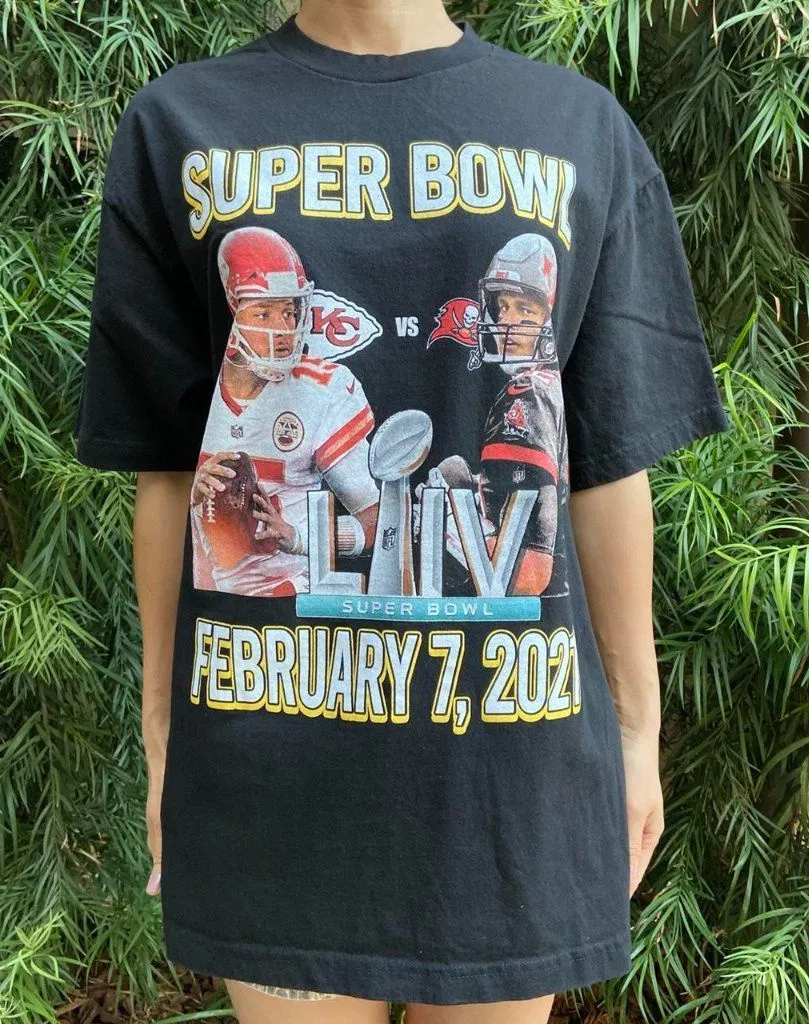 Super Bowl NFL "Chiefs vs. Buccaneers" Black short sleeve crewneck T-shirt. soft hand feel knit fabric with nicely worn washed look. large bold Art at front & back body.....looks cool! relaxed oversized Big Tee fit! no label within the garment, measures out to size M - L size L (men's) 29 1/2" top to bottom hem. 20 3/4" under arm. Model- Height: 5’2”, Size: S Next day shipping❣️ DM me with any questions 💫