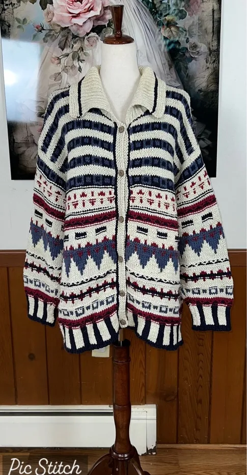 Gorgeous geometric design. Cozy and warm. Ideal for layering. Great condition! Bust measures 54”, le... Show more