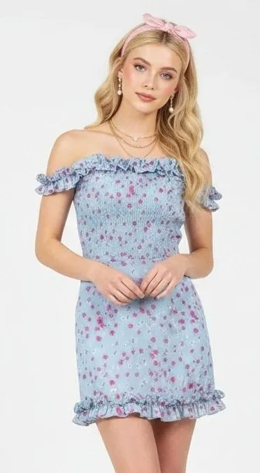 100% polyester Hand wash cold Fully lined Off-the-shoulder mini dress with elasticized neckline Ligh... Show more