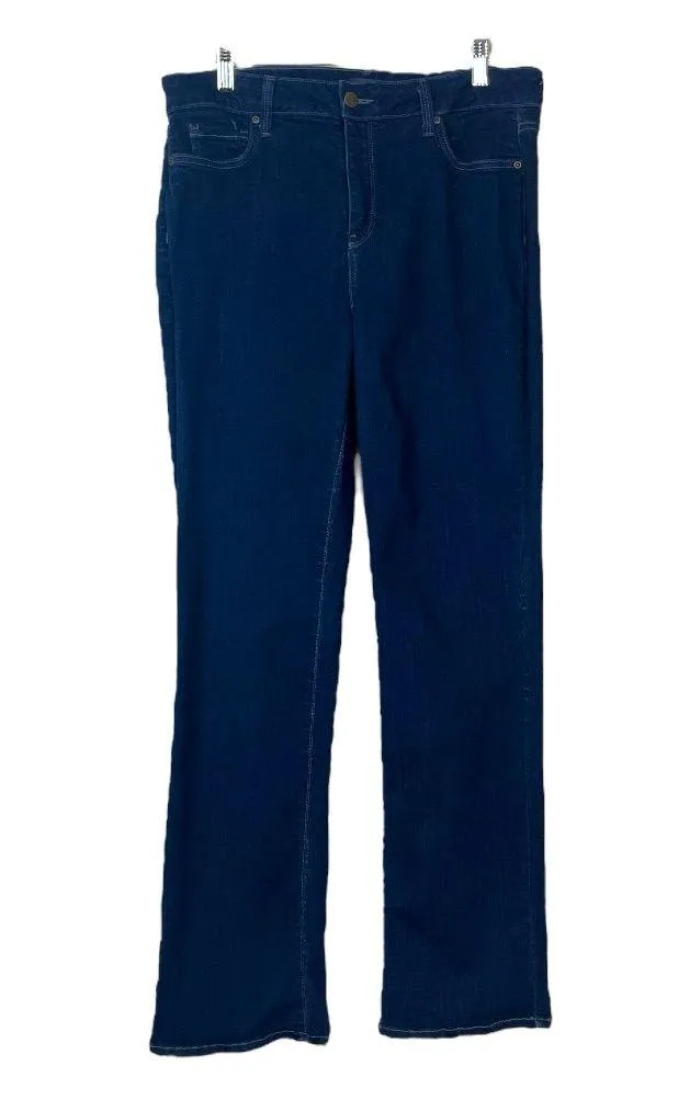 Style Details • Not Your Daughters Jeans • Lift Tuck Technology • Marilyn straight leg, mid rise • 5 pocket design • Dark indigo blue denim wash • Zip fly & button closure • Cotton, polyester, lyocell & elastane • Machine washable • Excellent used condition Approximate Measurements • Size 14 - stretches • 16” across waist • 30” inseam, 10” rise • Measurements taken across laying flat Denim wardrobe basic simple easywear minimalist neutral stretch midsize stretch tummy control slimming slenderizing plus size curvy midsize