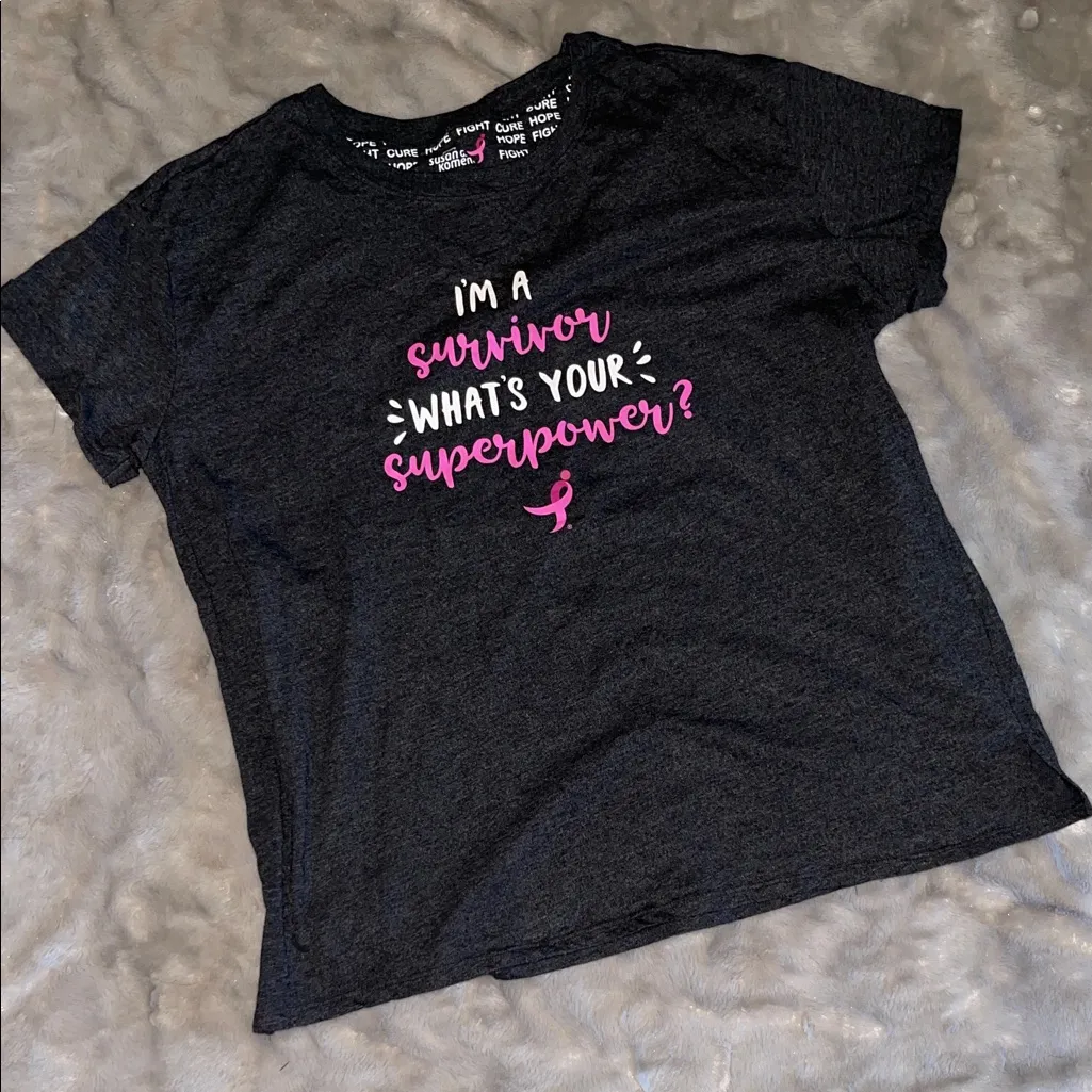 Celebrate strength and resilience with this Susan G. Komen graphic tee. Featuring the empowering message "I’m a survivor, what’s your superpower?" in bold white and pink text, this dark gray shirt is a tribute to breast cancer warriors. The iconic pink ribbon and motivational typography make it a standout piece for awareness events or everyday wear. Brand: Susan G. Komen Size: XXXL (22) Color: Black with Pink & White Graphic Material: 60% Cotton / 40% Polyester Condition: Excellent pre-owned, no flaws Made in: China Care: Machine wash cold, tumble dry low, do not iron print Perfect for gifting, layering, or styling with jeans and sneakers. Show your support and wear your story with pride.