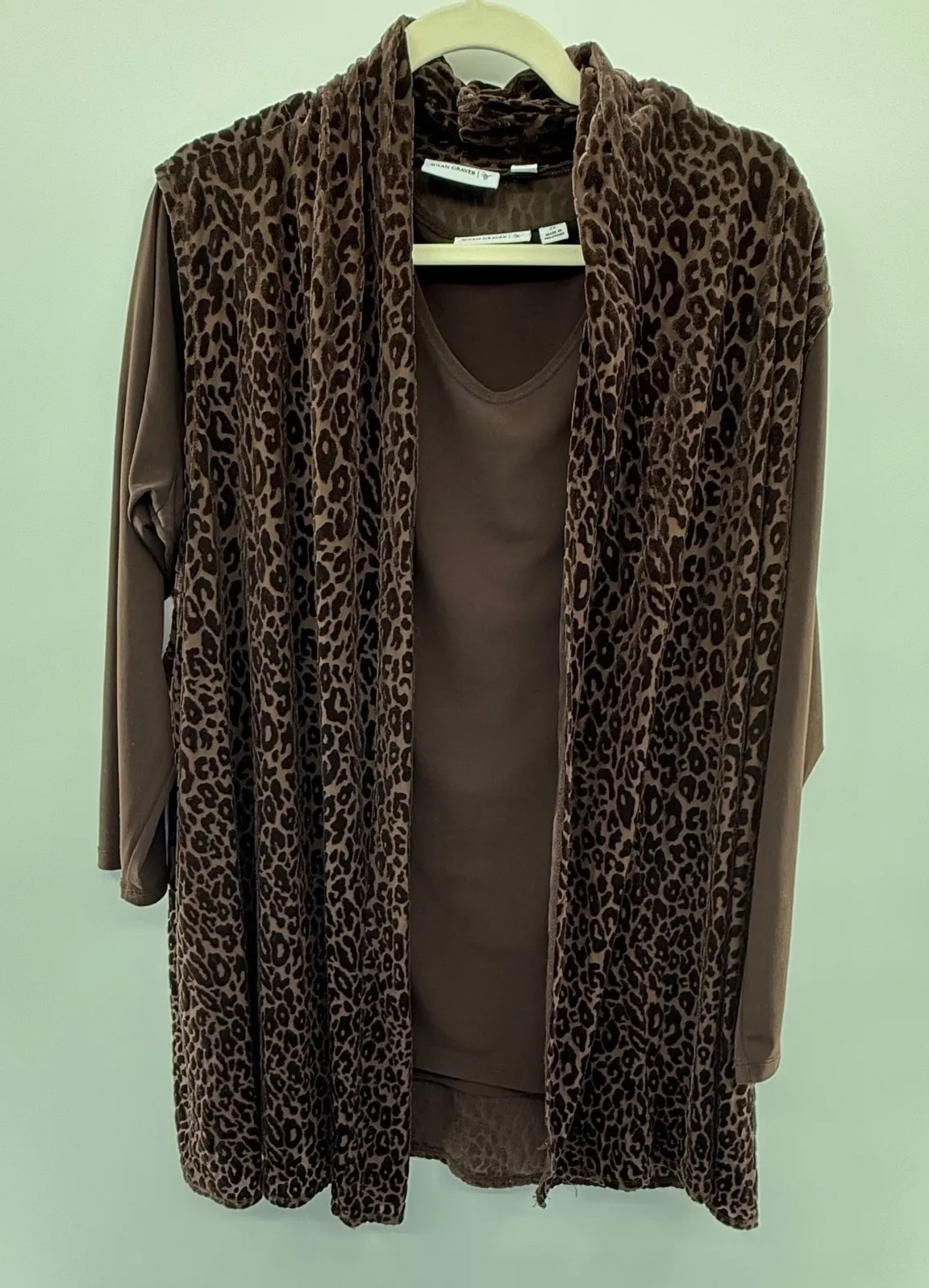 Stylish and cozy Susan Graver 2-piece women's set, size 2X. Includes a soft stretch brown long sleeve knit top and coordinating open-front velvet leopard print vest. Perfect for layering, travel, or casual-chic fall and winter looks. The plush animal print adds a luxe touch while staying comfortable for work, weekend, or holiday gatherings. Effortless, flattering fit and easy care make this a versatile wardrobe staple. Originally sold on QVC, Susan Graver designs are valued for their easy-care Liquid Knit fabrics, flattering silhouettes, and reliable comfort. Excellent preowned condition with no flaws noted. Ships fast from Minnesota! Keywords: Susan Graver, Tunic Top, Leopard Print, Velvet Trim, Brown Top, Plus Size, 2X, 3/4 Sleeve, Women's Fashion, Comfortable, Layering Piece, Casual, Chic