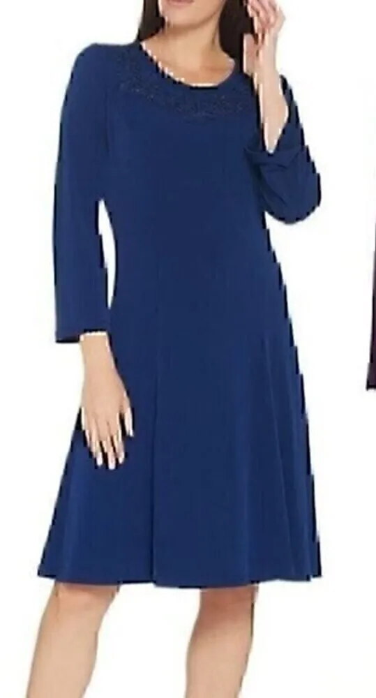 Susan Graver Artisan Liquid Knit Dress w/ Beaded Applique a344868 size small solid plum purple fit & flare dress embroidered flower floral embroidery / rhinestone detail 3/4 sleeve party work office business stretch knit pullover approx knee length depending on height 95% polyester, 5% spandex - machine wash/dry good overall condition, faint spots throughout (not sure if staining or fading, or if this will come out - if not, great with a shawl/scarf or cardigan over!); if any rhinestones are missing it isnt noticeable; minor runs/snags possible FITS LIKE BLUE; SELLING PURPLE Measurements (flat): Bust: 17 in unstretched, has stretch (Fits 34") Waist: 15 in (Fits 30") Length: 39 in