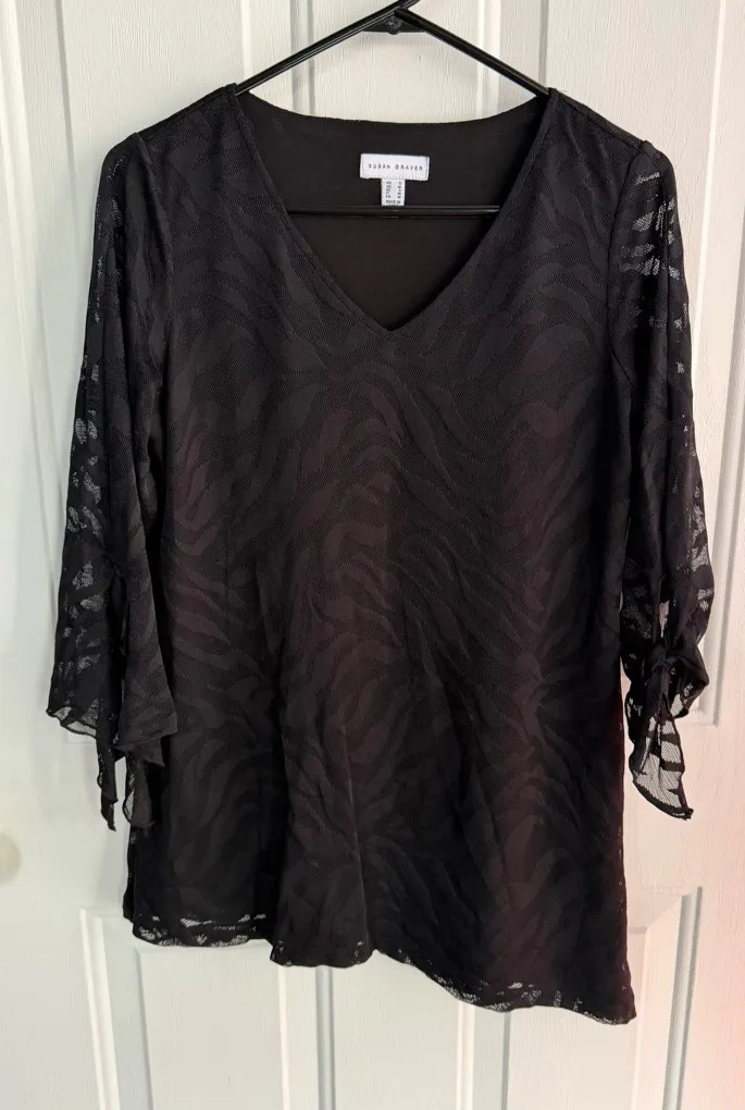 Beautiful Susan Graver black mesh top, NWOT, featuring a soft lined body and a sheer mesh overlay with an abstract animal-print texture. V-neckline, lightweight feel, and tie-detail sleeves. Front hem is slightly asymmetrical with a subtle diagonal cut — one side measures longer than the other. Perfect for casual-to-dressy outfits. Approximate Measurements: • Bust: 18.6 in • Front Length (asymmetrical): 28.8 in (longer side) / 27.2 in (shorter side) • Sleeve Length: 17.2 in Material: • Shell: 93% Nylon, 7% Spandex • Lining: 95% Polyester, 5% Spandex Condition: NWOT – New without tags.