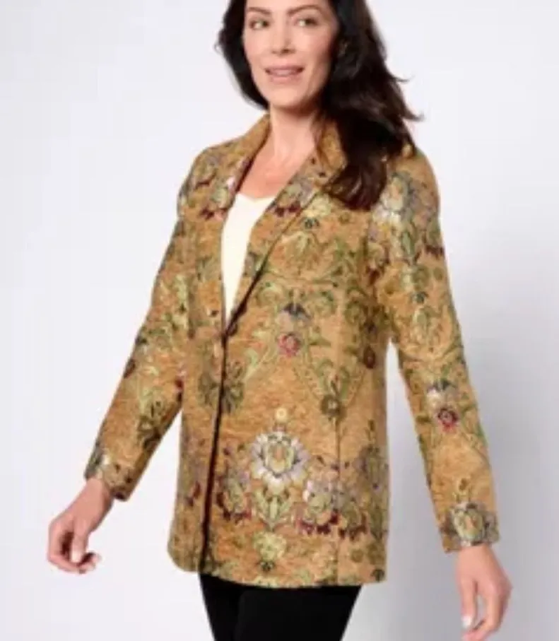 A statement brocade jacquard blazer jacket by Susan Graver. This eye-catching piece features a rich... Show more