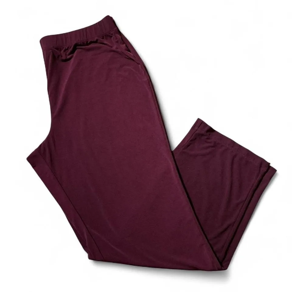 Susan Graver Essentials women's lounge pants in a rich burgundy hue. These comfortable pants feature a flexible elastic waistband for a perfect fit and a relaxed, wide-leg silhouette. The soft fabric drapes beautifully, offering both comfort and style. Ideal for casual lounging at home or running errands in style. Keywords: lounge pants, burgundy, elastic waist, wide leg, relaxed fit, comfortable, casual wear, home wear, athleisure, soft fabric, everyday, versatile All clothing are cross posted, #Minimalist #Knit