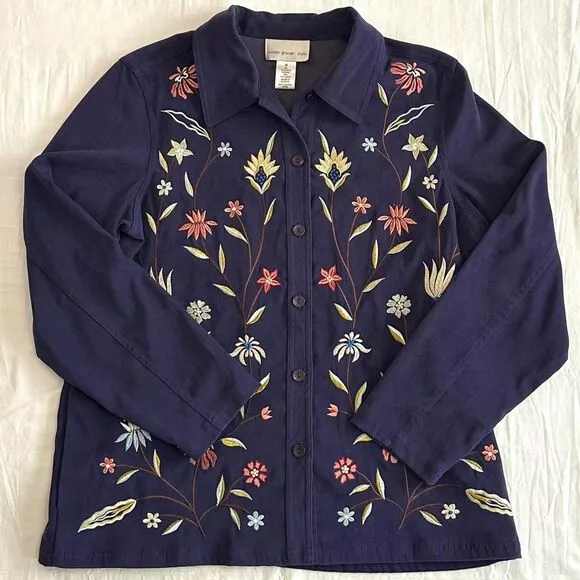 susan graver style navy fully lined button front shacket with gorgeous multicolored floral embroidery, size medium in very good condition, no noticeable flaws MEASUREMENTS: pit to pit 23in flat across, length 27in #boho #hippie #fairycore #whimsigoth #cottagecore