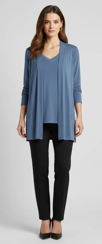 Measurements: • Pit-Pit : 22 inches • Length: 31 inches Department: Women Set Includes: T-Shirt, Cardigan Color: Slate Blue Size: XL Fabric: 95% Modal, 5% Spandex Condition: Excellent — clean, soft, no visible flaws Type: Outfit/Set Susan Graver | twin set | modal cardigan | matching top | soft stretch | lounge set | women's XLP | blue drape cardigan | travel outfit | layering top | luxe basics | elevated essentialsr I ship out items Monday-Friday. • All items come from a pet-free, smoke-free home. • Please compare the measurements to something you already own. Thank you for visiting my store.