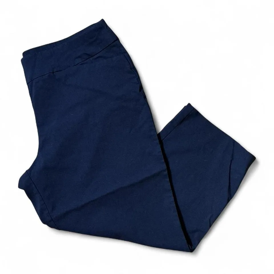 Susan Graver navy blue cropped pants with an elastic waistband. These comfortable and versatile pants offer a relaxed fit perfect for everyday wear or travel. Keywords: Susan Graver, navy pants, cropped trousers, elastic waist, women's casual, capri pants, comfortable, travel pants, everyday wear, plus size option, straight leg, pull on pants All clothing are cross posted, #BusinessCasual #Resortwear