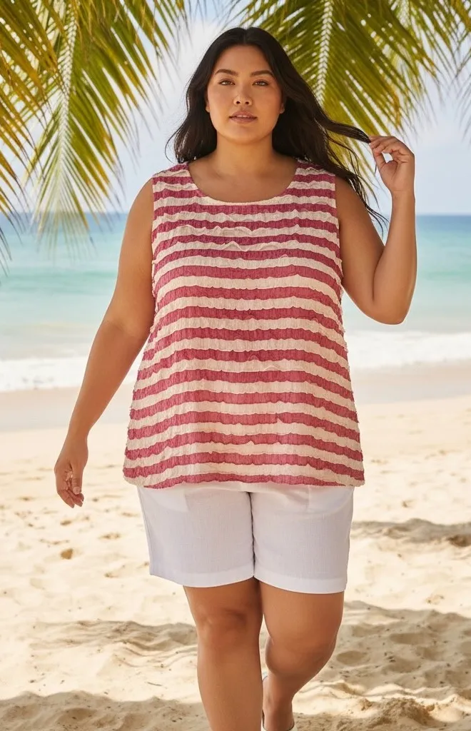 Elevate your warm-weather wardrobe with this charming Susan Graver tank top. The captivating striped pattern in soft pink and creamy ivory is enhanced by a unique textured ripple effect, creating a playful yet sophisticated look. Its sleeveless design and breezy silhouette ensure comfort and style on sunny days. Perfect for a casual beach outing, a relaxed brunch, or a vacation getaway. Measurements: • Pit to Pit: 27" • Shoulder to Hem: 30" Type: Tank Department: Women Style: Tunic Material: Polyester, Nylon, Spandex Neckline: Round Neck Sleeve Length: Sleeveless Sleeve Type: Casual Sleeve Pattern: Striped Accents: Ruffle Features: Lightweight, Stretch Fit: Relaxed Fabric Type: Knit Occasion: Casual, Travel Closure: Pullover Season: Summer, Spring Keywords: Susan Graver, plus size top, striped tank, textured ruffle, sleeveless shirt, pink and cream, casual wear, summer fashion, vacation outfit, beachwear, resort style, lightweight top