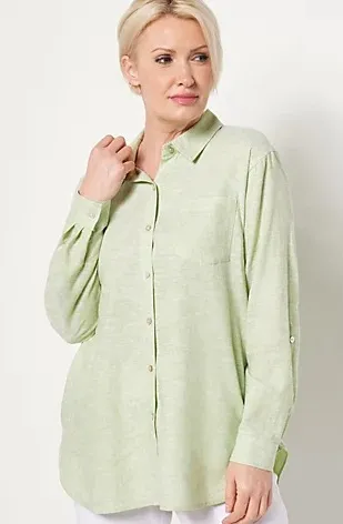 New without tags. Tried on for last picture for reference if you wanted to use it as a cover up. I’m a size small and it would be perfect as a coverup so anyone from small to XL can use this top. Can also be a formal top for a business professional like the first picture and everything in between. Bought for $66.15. No flaws! Super soft and has POCKETS! Shade is “palm leaf” This tunic is equal parts polished and chic -- ready to grace the office with style or bring personality to that wide-leg pants and hat 'fit at brunch. We're here for the versatility! From Susan Graver. Fabrication: woven Features: collared, button-front, patch pocket at left chest, tunic length, shirttail hem Fit: relaxed fit; generously cut with maximum wearing ease Length: missy length 29-1/4" to 31-5/8"; plus length 32" to 35-1/2" Content: 55% linen/45% rayon Care: machine wash, dry flat
