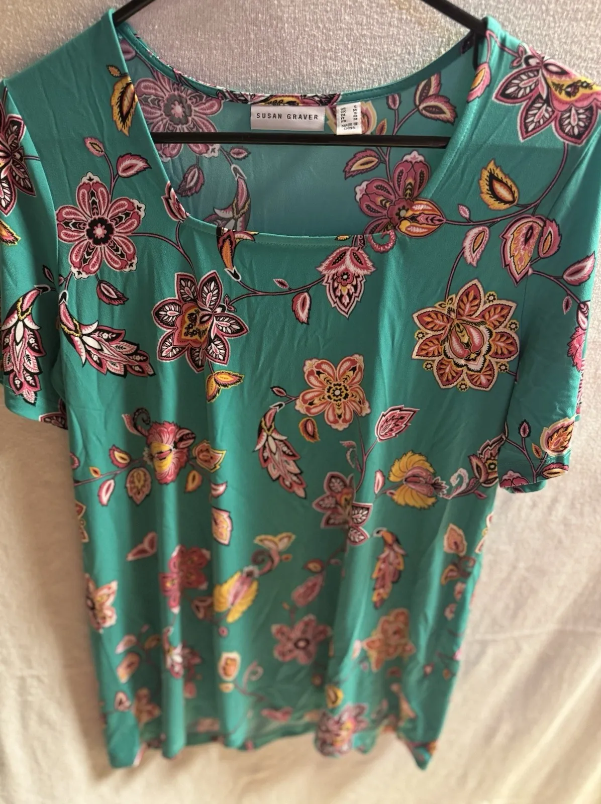 The Susan Graver Top is a stylish women's blouse featuring a green floral paisley pattern, made from... Show more