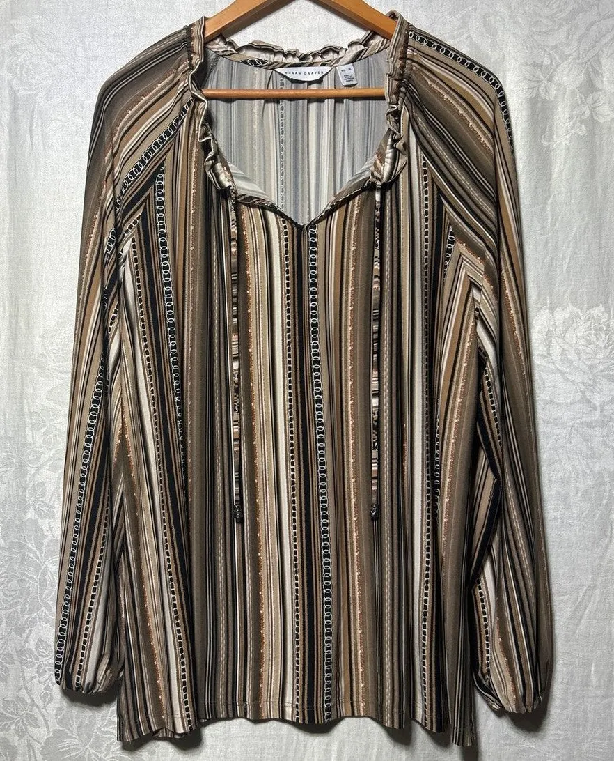 Susan Graver Top XL Brown Vertical Striped Ruffle Collar Tie Liquid Knit - $26 - From Jennifer