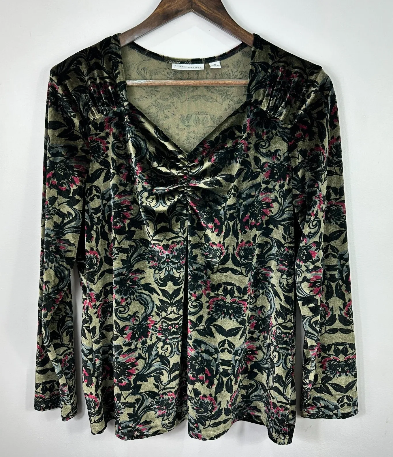 Susan Graver Velvet Top Women M Long Sleeve Floral Ruched Goth Romantic Grunge Susan Graver long sleeve ruched front top in a luxurious velvet finish, featuring an olive green, black, and magenta floral baroque-inspired pattern. Flattering sweetheart neckline with gentle gathers at the shoulders adds a touch of drama. This stretchy, soft piece blends romantic and goth aesthetics effortlessly — great for night out, vintage lovers, or Y2K layering. In excellent pre-owned condition. Goth Glam, Romantic Grunge, Baroque, Vintage Inspired, Night Out, Whimsigoth, Fairycore, Y2K, Moody Florals, Fall Fashion, Velvetcore, Quiet Luxury, Dark Romance Condition: Gently pre-owned, no flaws Measurements (laying flat): Pit to Pit: 20.5 in Length: 25 in Fabric / Made in: 95% Polyester, 5% Spandex