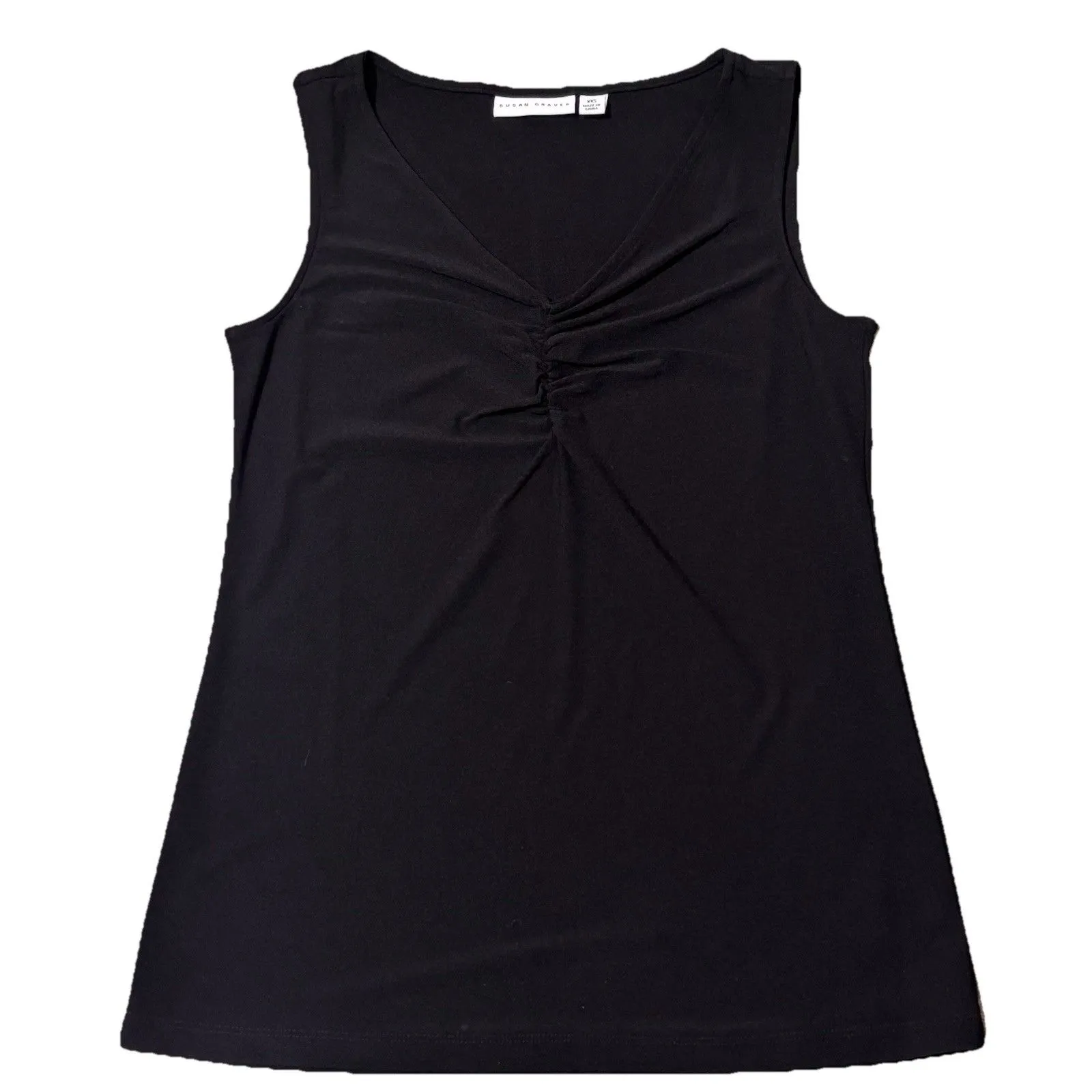 This Susan Graver Womens Black Rouched V Neck Tank Top in size XXS is a stylish and versatile addition to any wardrobe. Made from a comfortable blend of polyester, spandex, and elastane, it features a sleeveless design with a flattering V-neckline and wide straps. The pullover closure makes it easy to wear for casual occasions during the warmer seasons of spring and summer. With its basic yet chic style and stretch fabric, this top is sure to become a go-to piece for everyday wear. Approximate measurements laying flat Chest 15 Length 24 Preowned. Smoke free