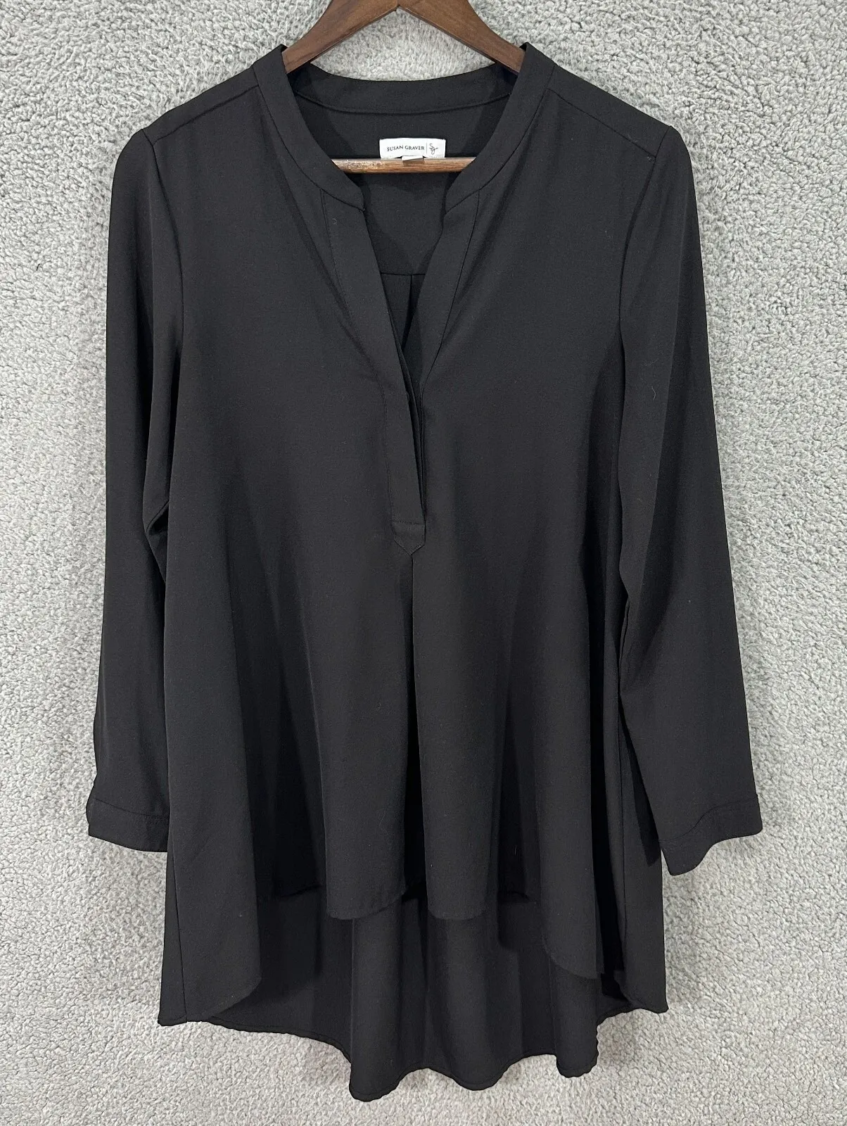 Susan Graver XS Black Tunic Top Womens Blouse High Low Hem Career Minimalist This Susan Graver black tunic top in size XS offers timeless elegance with a modern twist. Designed with a flowy high-low hem and a clean minimalist neckline, it's the perfect blend of comfort and sophistication. Ideal for workwear, evenings out, or polished casual looks, this blouse is versatile and flattering. Whether layered under a blazer for the office or worn with sleek pants or leggings, this piece embodies quiet luxury with a refined silhouette. * Brand: Susan Graver * Size: XS * Color: Black * Style: Tunic Top / Blouse * Neckline: Split collar * Hem: High-low hem for added flow and coverage * Sleeve: Long sleeve * Material: Lightweight polyester blend (comfortable drape) * Occasion: Work, business casual, evening, dinner, travel * Condition: Excellent pre-owned quiet luxury, career chic, minimalist, elegant, workwear, timeless, mature style, professional, elevated basics, office wardrobe, versatile blouse