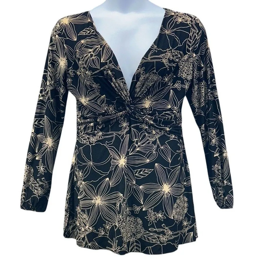 Enchanting floral patterns dance across this elegant blouse, creating a captivating visual experience. The deep V-neckline adds a touch of allure, while the unique twist-front design cinches the waist for a flattering silhouette. Long sleeves provide coverage and sophistication, making it a versatile piece for various occasions. The flowing fabric drapes beautifully, ensuring both comfort and style. Measurements: Pit to Pit: 19.5 Length: 30 Thank you for checking my item. If you have any questions before and after purchase, please contact me first. Items came from smoke free, dog friendly home Please check measurement before buying. Measurements are also on photo. My handling time is 1 business day. Bundle and save Have a great day!!!!!