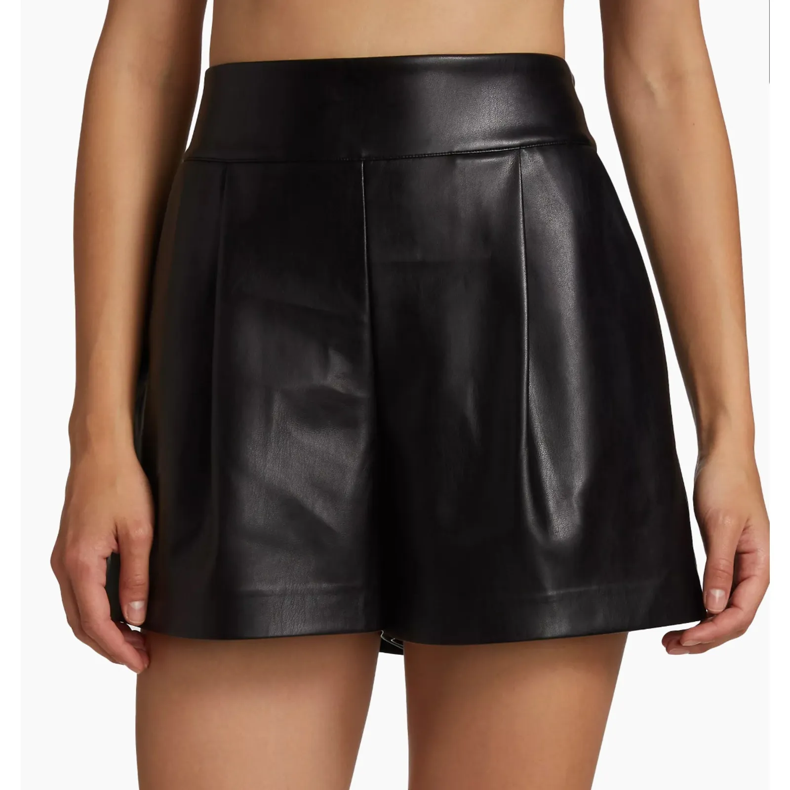 Susana Monaco Faux Leather Pleated Shorts black size Large Pre-owned. No flaws. Smoke free home. Faux leather shorts styled with a pleated front. Elasticized waistband Side on-seam pockets Pull-on style 100% polyurethane Wipe clean Made in USA Inseam, about 3"