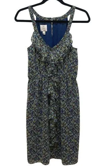 - cinch waist - ruffle detail on neckline down center front of dress - button closure with open eyelet keyhole on backline Size: 6 Pit to pit: 16” Length from neck to hem: 28”